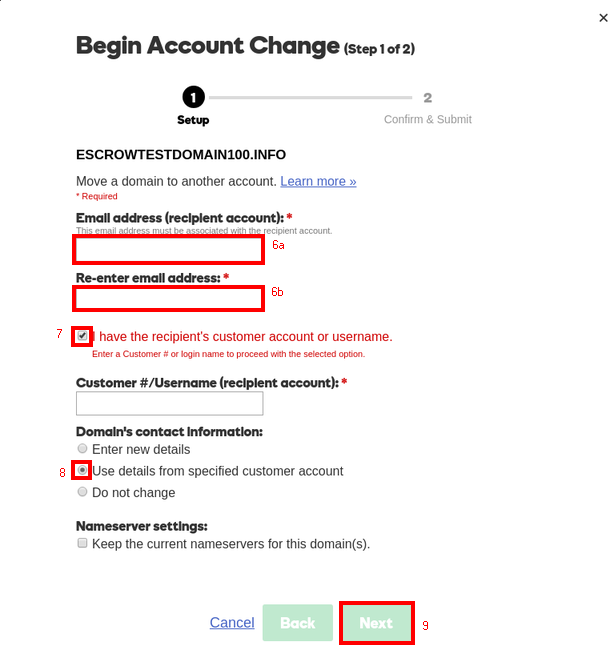 To transfer a domain from your GoDaddy account to another GoDaddy account, you will need to perform an Account Change. This moves ownership of the domain name from one GoDaddy account to another. Make sure you only do so after you have been instructed to do so by Escrow.com, when the funds are secured in our Escrow.com.