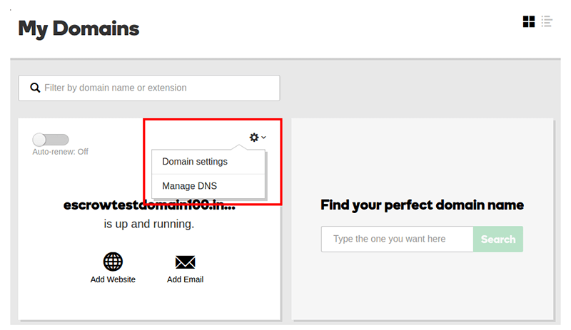 On the tile of the domain you wish to transfer out, select the cog icon and then click Domain Settings.