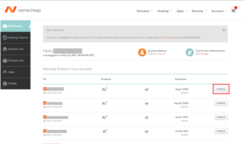 - On the Dashboard tab in the sidnav, click the Manage button for the domain you wish to transfer.