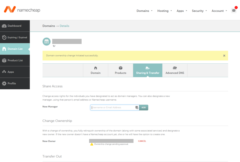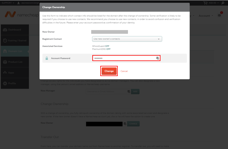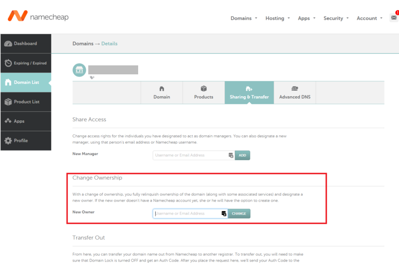 How to transfer a domain out of your NameCheap account using Change Ownership