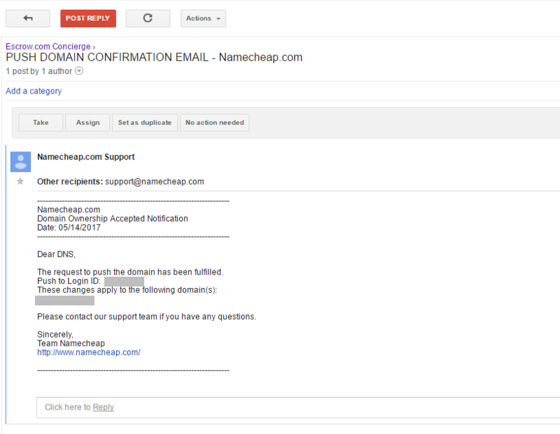 The buyer will receive an email from NameCheap with instructions on how to accept the Change Ownership into their account. Once they complete the steps in the email or in our Guide, you will receive an email from NameCheap confirming that the domain has been transferred.